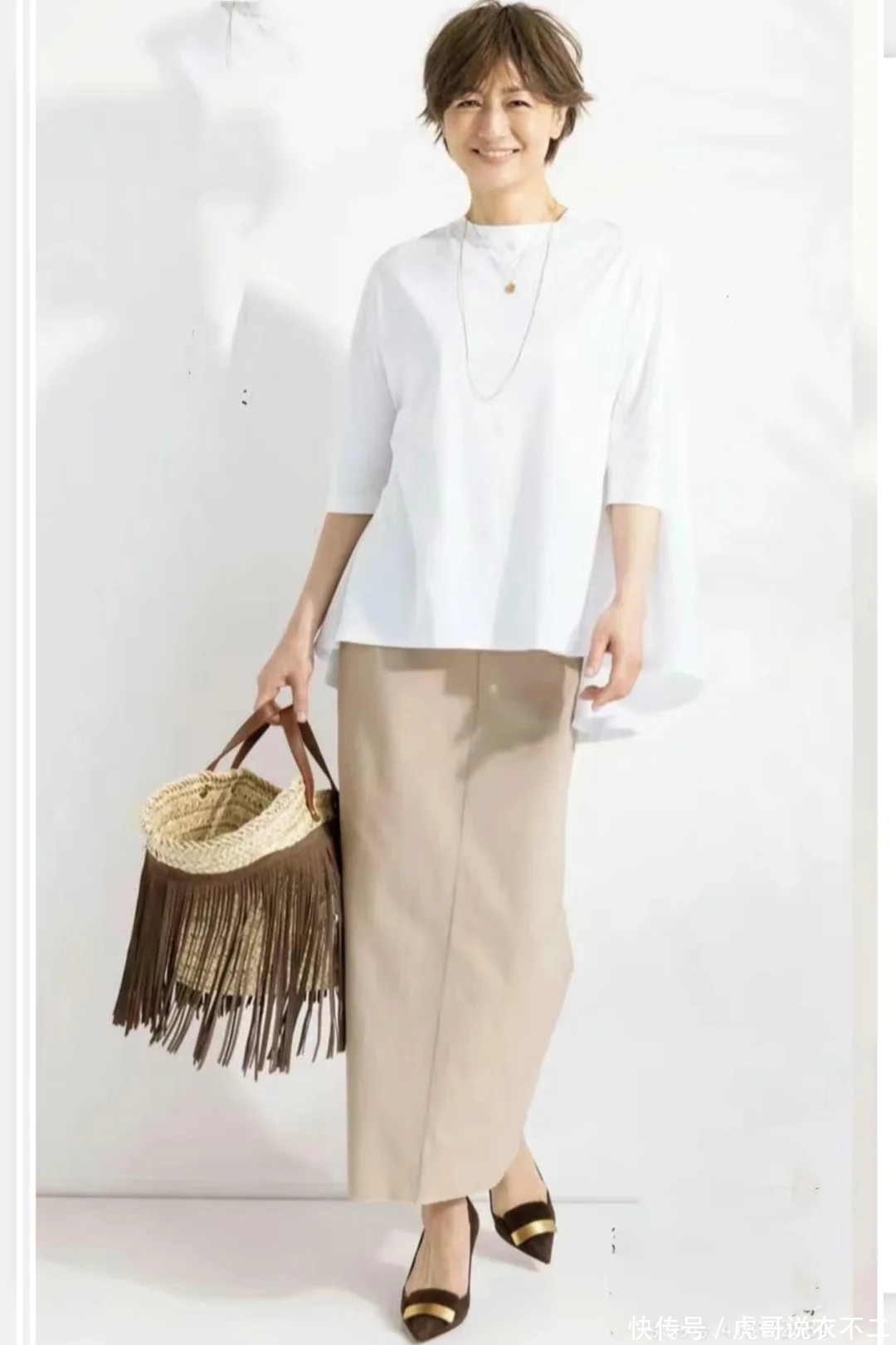 50岁女性穿适龄得体的衣服,才能将这一年龄阶段的风采诠释到淋漓尽致。短裙、短裤或者各种另类单品虽然个性时髦,但却不够落落大方。白色套头衫配卡其色半身长裙,非常舒服的色彩搭配,温柔感轻松翻倍。