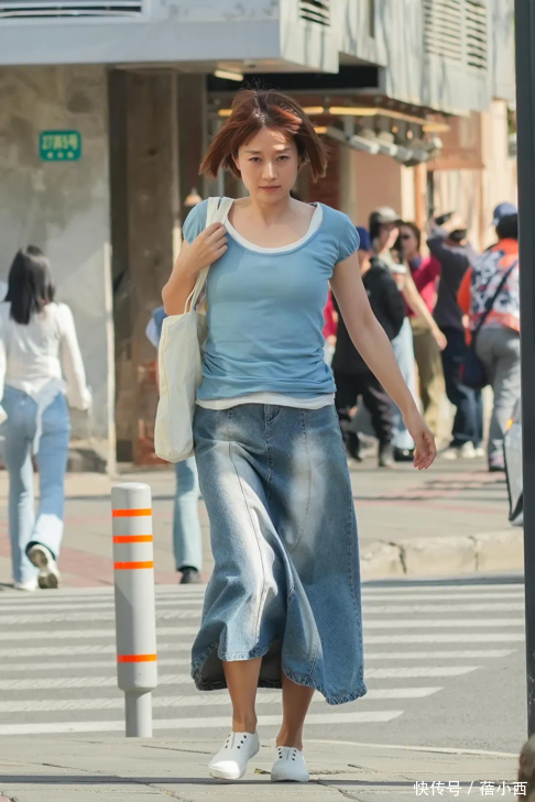 再看马伊琍这件蓝色t恤和牛仔半身裙的搭配,蓝色,宛如夏日晴空与大海的颜色,给人带来清新与宁静的感觉,能让白皙的肤色更显透亮。大领口和泡泡袖的设计堪称点睛之笔,增加了复古俏皮的风格,轻松体现了几分少女感,同时还能露出锁骨,遮挡住手臂上的拜拜肉,显瘦时髦两不误。