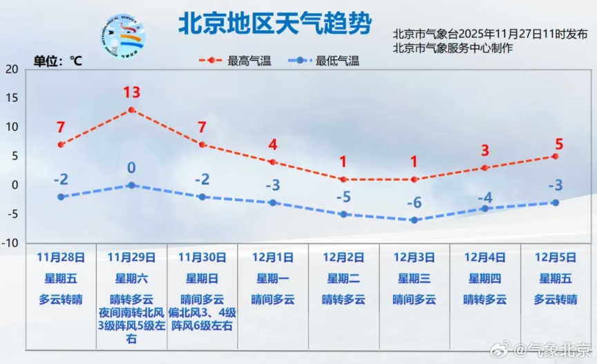 明天将开启2025年的最后一个月。下周一京城天气逐渐转阴,白天北风暂停,但夜间仍有三四级左右的偏北风,阵风六级左右。另外,傍晚前后西部北部还会有零星小雪或小雪。