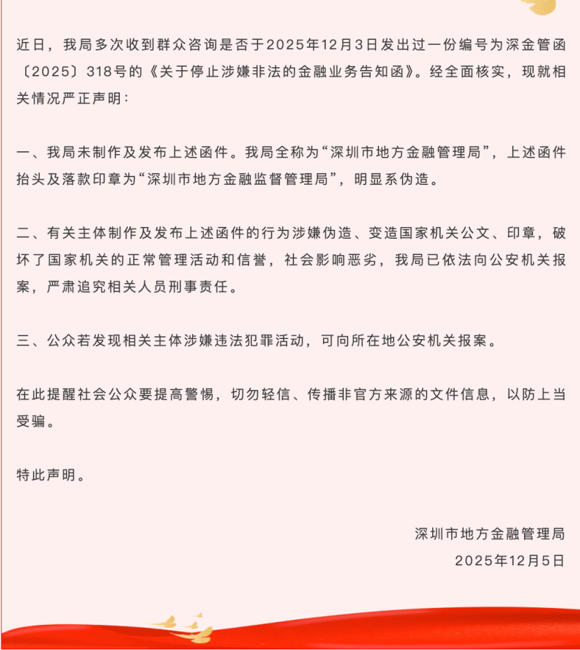 12月6日,深圳市地方金融管理局就上述情况发布严正声明: