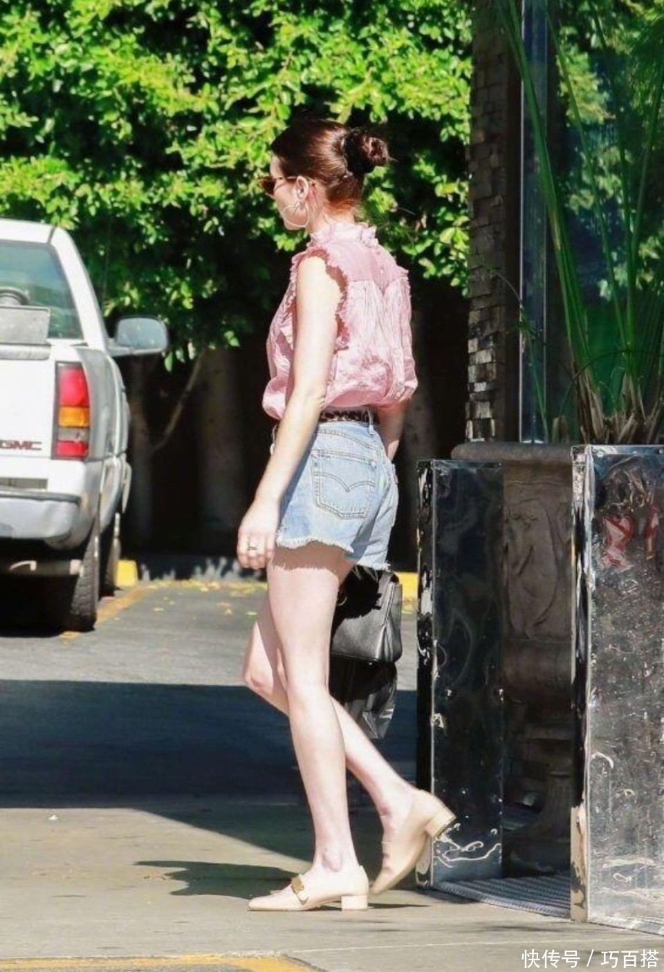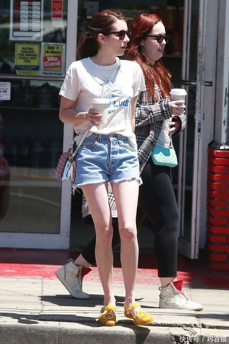 在选择牛仔短裤的情况下,艾玛罗伯茨会选择相对低调的单品以及配饰与之搭配,为了衬托美腿的存在,基础纯色单品以及配饰是她的最爱。