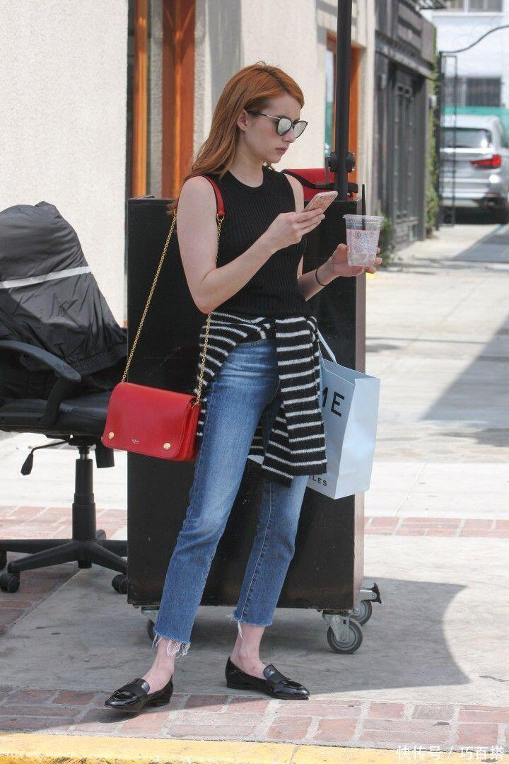 高腰修身类牛仔裤最适合借鉴的穿法就是塞衣角,为了凸显时髦魅力,艾玛罗伯茨会选择高饱和度的配饰与之搭配。